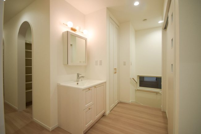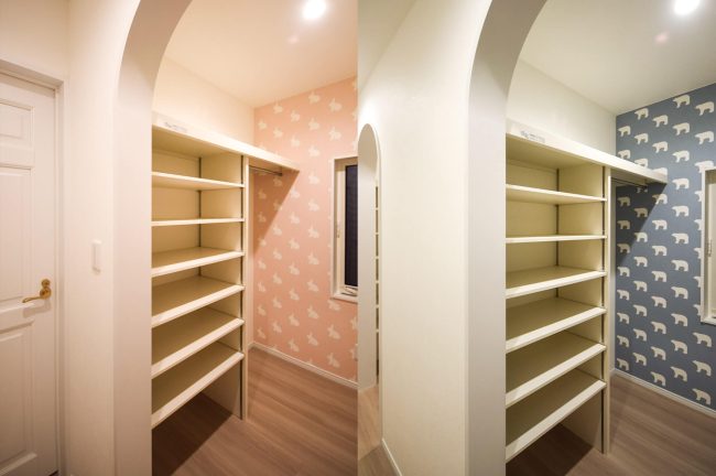 廊下に並ぶ可愛らしいウォークインクローゼット 2つのアーチと