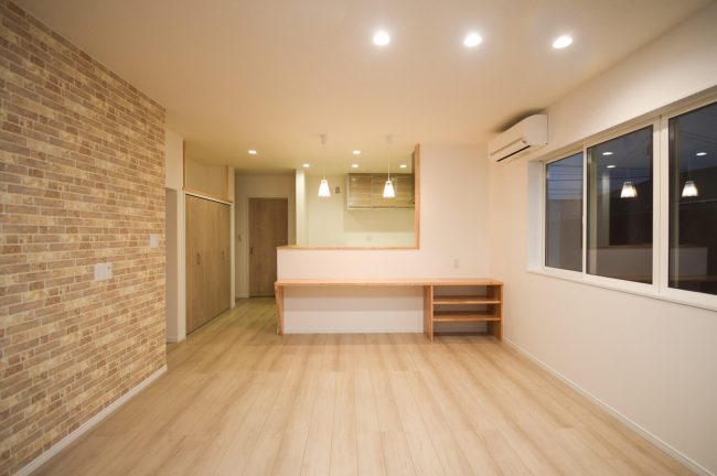 親世帯リビング 明るい空間にレンガ柄をアクセントで重厚感を演出